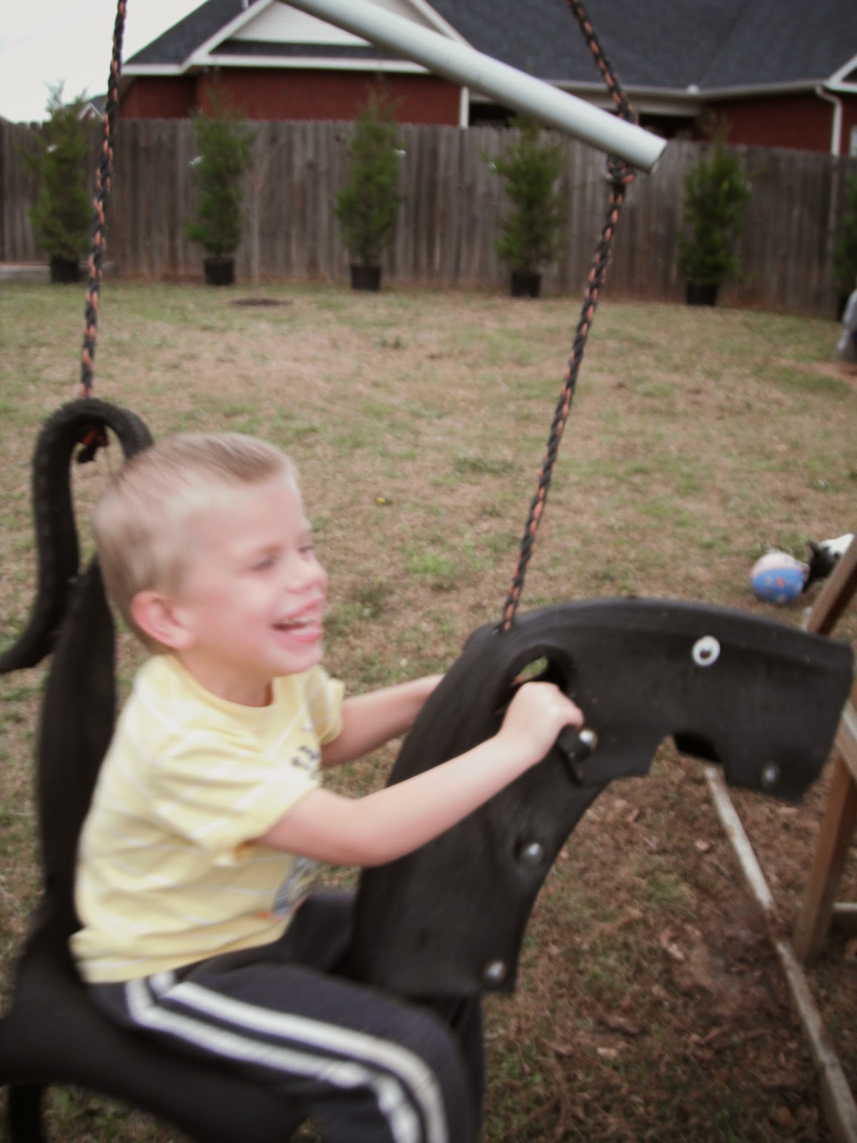 One of my main reservations about buying this house was the view from the kitchen. Beyond our back yard we can see the top half of our neighbor's back porch and kitchen windows, which means they can see us too. I don't like it. So yesterday we bought 6 murray cypress trees to place along the back fence. They will grow tall and wide and block the view of our neighbor's house. They're supposed to grow 2-3 feet per year. A man from the nursery delivered them late yesterday afternoon and Gavin was happy to help me transport them to the back fence: